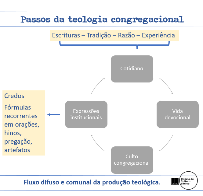A teologia congregacional, por outro lado, é produzida consensualmente no contexto dos cultos da igreja e da vida diária. Suas raízes estão no Templo, nas sinagogas e nas igrejas, onde os entendimentos teológicos emergiram das experiências compartilhadas e da sabedoria coletiva da comunidade. Essa abordagem enfatiza a dimensão vivida da teologia e o papel dos leigos na formação da compreensão teológica.